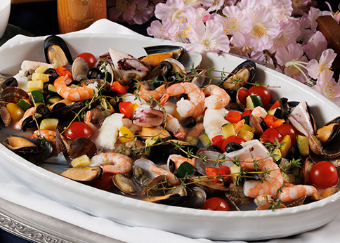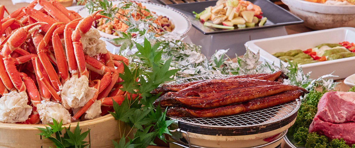 ディナーはライブ感とオリジナリティ溢れる和食・洋食メニューが魅力の豪華バイキング。ランチは季節毎にコンセプトを持った地産地消メニューなど、朝食は朝から元気に一日をお過ごし頂けるよう、和食と洋食の人気メニューを豊富にご用意しています。 ※当店で使用しているお米は国産です。